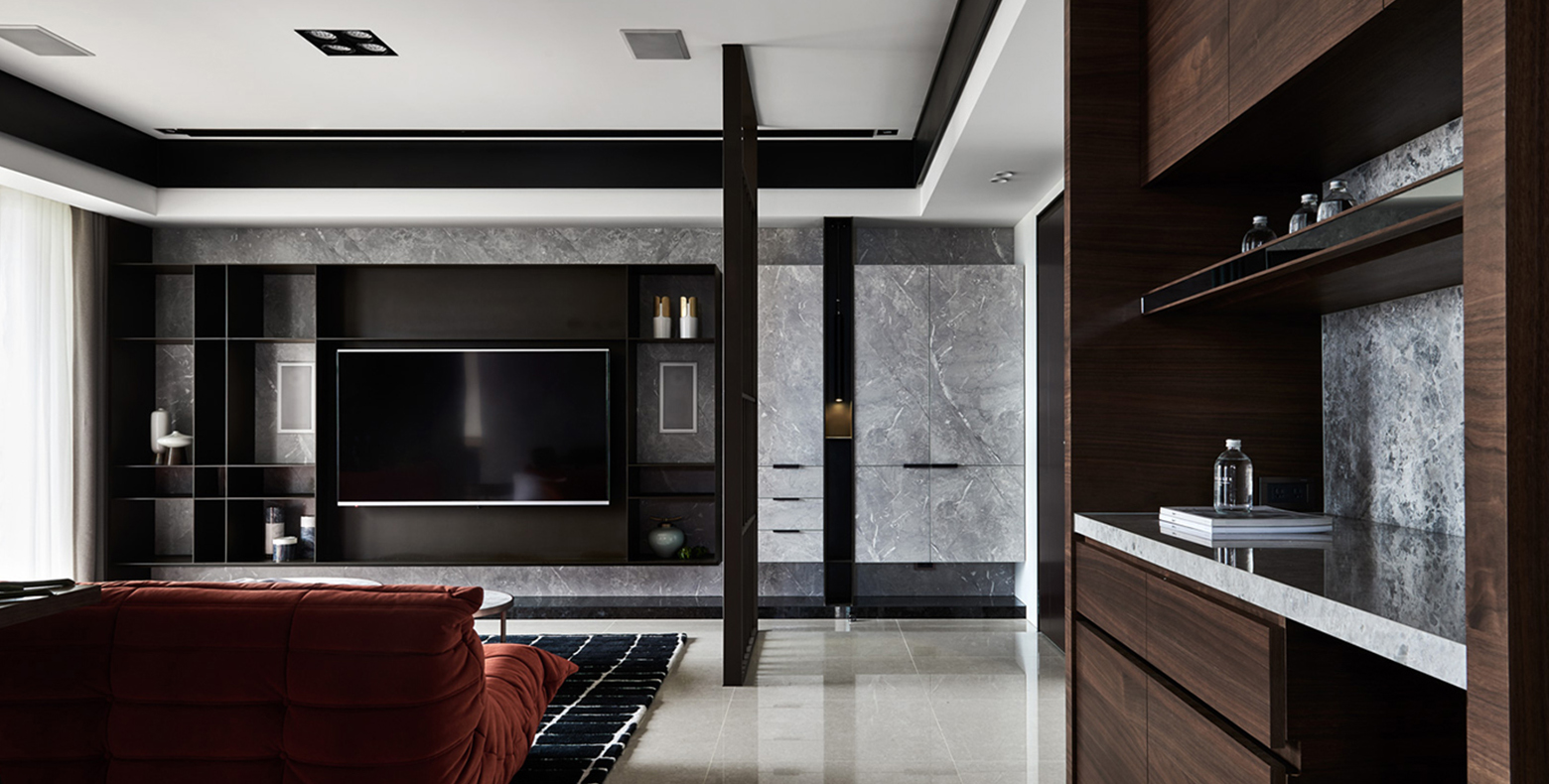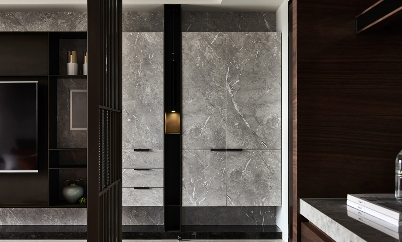 室內(nèi)現(xiàn)代暗色系搭配石材的設(shè)計(jì)能營(yíng)造出一種高雅和現(xiàn)代感的氛圍。暗色系可以包括深灰、墨黑、深藍(lán)等顏色,與石材的質(zhì)感相